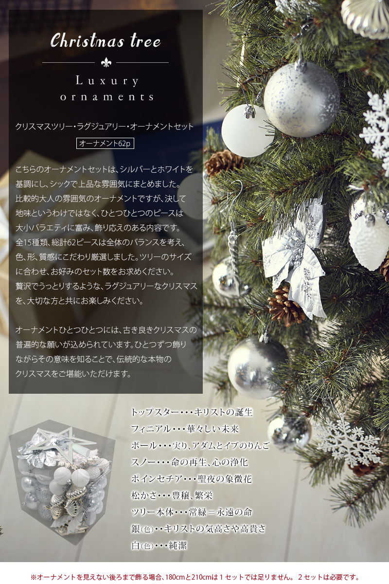 [オーナメント各ツリーサイズ推奨セット数] 120cm…1set 150cm…1set 180cm…ぐるりと1周飾る場合は2set 210cm…ぐるりと1周飾る場合は2set バランスよく飾り付けるのに上記set数をお勧め致します。