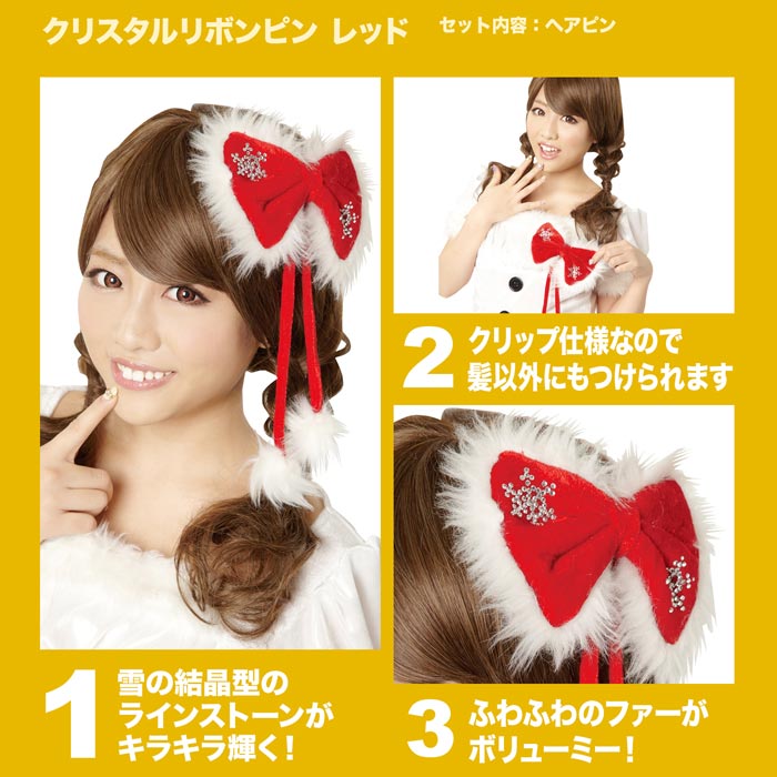 ≪Cristmas costume≫クリスタル リボンピン大きなリボンに、ふわふわのファーがボリューミー!雪の結晶形のラインストーンがキラキラ。