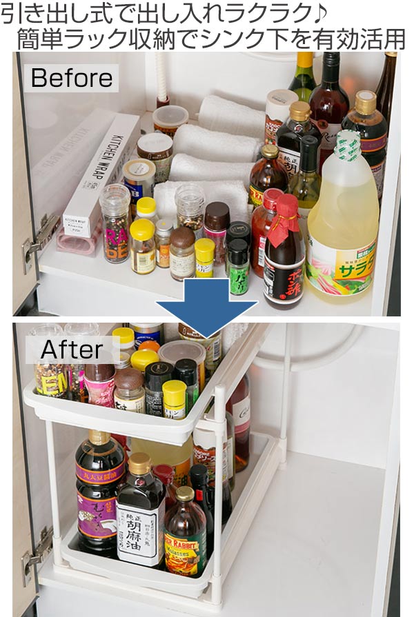 商品区分キッチン収納用品カテゴリから探すキッチン収納 シンク下 スライドラック 2段 ワイド キッチンラックスライドラックでシンク下をスッキリ収納!こまごました調味料や、ボトル入りの油や醤油など、シンク下はいつの間にかごちゃごちゃしがちです。