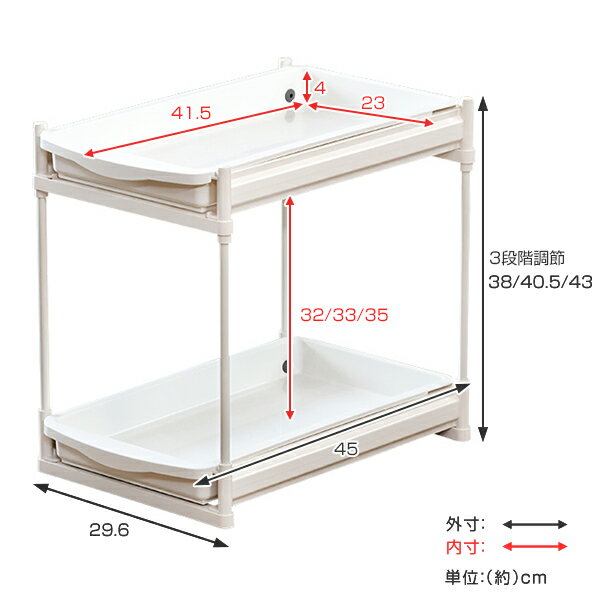 高さ調節が可能なトレー収納するモノの高さに合わせてトレーの高さを2.5cm刻みで3段階(38/40.5/43cm)に調節できます。