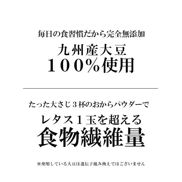 九州産を100%使用し、NON-GMO・無添加の安心安全使用でご案内いたします!当店のおからパウダーは全粒ですので、プロテイン代わりに飲んでいただくなどするよりも、お料理に混ぜていただく方が断然おすすめ!当店のグルメなお客様にむけたおからパウダーでございます!