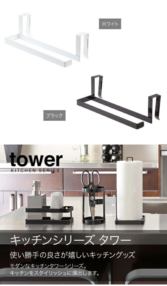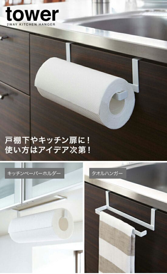 山崎実業 YAMAZAKI tower キッチンペーパー&タオルハンガー タワー 戸棚下やキッチン扉に!使い方はアイデア次第! キッチン扉や戸棚下に!吊り下げ戸棚とキッチン扉の2つの場所で使える2ウェイハンガー。